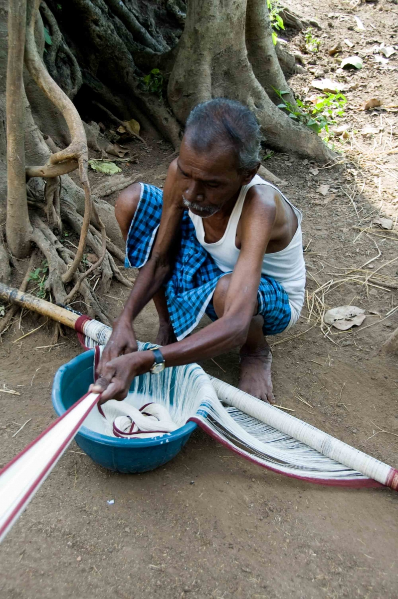 At this stage again the yarns are coated with rice starch. This is done in the streets by dipping the yarns in the bowl of rice starch in small sections and rubbing between hands . The warp yarns are treated with a light rice starch to increase its strength.