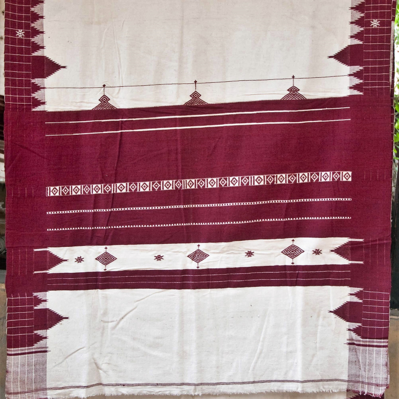The throw-shuttle pit loom known as mangtha is made up of sagwan i.e. teak wood or saal (Shorea robusta). Weavers get their looms made on order from carpenters (badhai) . The simple pit-loom can weave plain weaves and can be adjusted to create a varied or complex patterns such as figure or geometric patterns. However the beauty of its production depends largely upon the skill of the weaver.