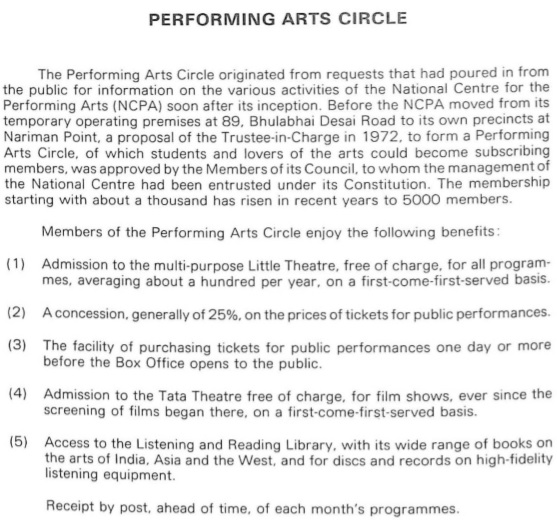 A short descriptive article about the Performing Arts Circle, a membership program, of NCPA, Mumbai. Journal Date of publication 1st Jan 1988