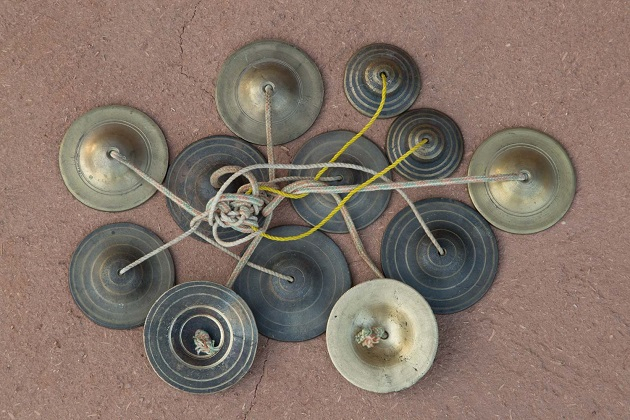 Manjira: A percussion instrument, manjiras are little cymbals commonly used in devotional music in India, known for their sharp clanging sound. Female dancers of the Kamad community hold them in their hands and tie them to their legs in the Teratali folk dance. They ensure that they strike the manjiras even as they balance metal pots on their heads and sometimes hold swords in their mouths.
