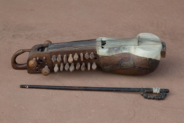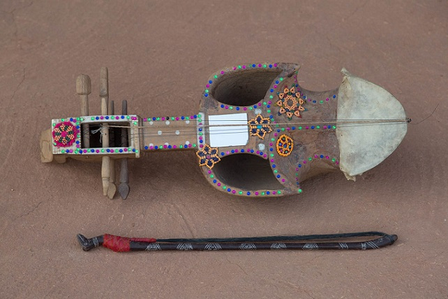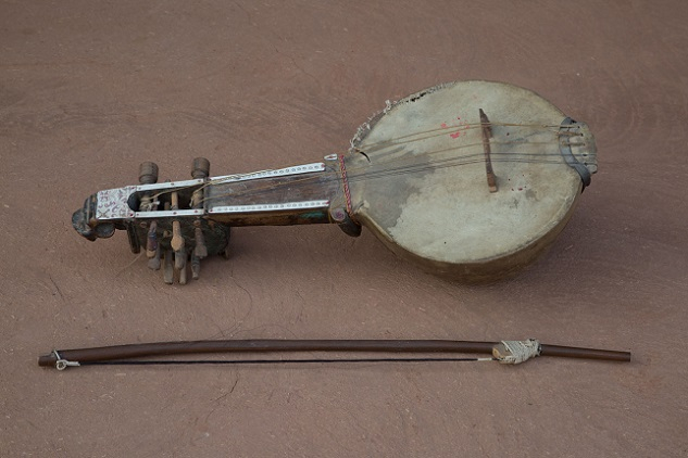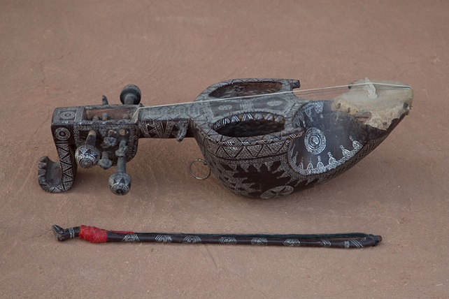 Kamaicha: This bowed chordophone is reflective of the shared history of the western frontier of South Asia, as it is only found in Sindh in Pakistan and western Rajasthan, used exclusively by Manganiar musicians. Komal Kothari traces its origins to Gujarat. It is immediately recognisable by its large, rounded body, covered with goatskin. It is usually carved out of a single block of mango wood and sometimes sheesham. Its two main guts strings are made of goat intestine and three other strings are made of steel. Altogether, it has 17 strings. It is played with a bow known as gaj. The kamaicha is known for its deep, haunting melody.