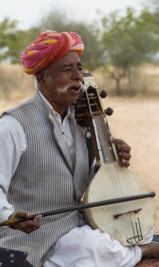 Hakam Khan Manganiar is seen here tuning the kamaicha.