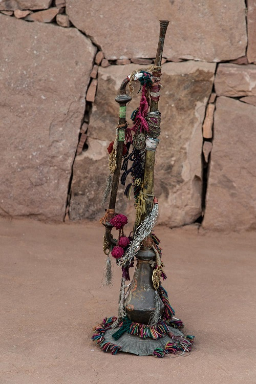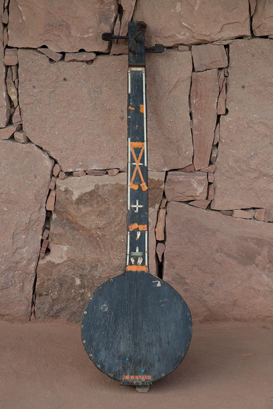 Ravanhatha: The long neck in this string instrument lends itself to being held up and played by Nayak or Bhil bhopas or priests as they dance in the Pabuji re phad performances. The sound of the ghungroos attached to the bow are an intrinsic part of the instrument’s music. The resonator is made of coconut shell, and one string of horse-tail hair and one or two of steel stretch across the long neck of the ravanhatha. Importantly, the bhopas themselves manufacture this signature instrument of theirs.