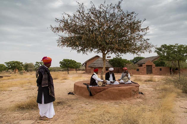 Seen from left to right seated under the tree are the musicians Pappa Khan Manganiar on the dholak, Shankra Khan Manganiar, Hakam Khan Manganiar on the kamaicha in an open-air setting at the museum. Multan Khan Manganiar looks on. In the background are the mud buildings housing one of the museum displays