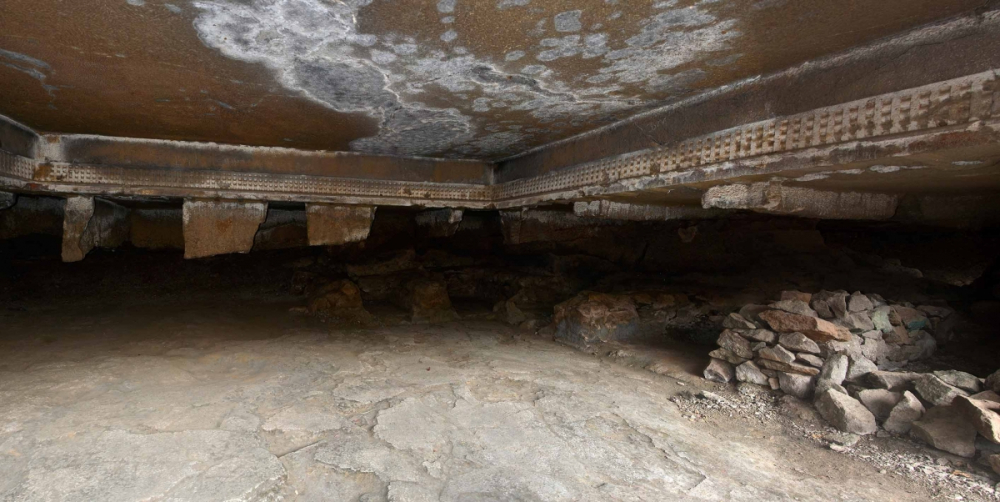 Cave 9 consists of a hall surrounded by cells on the three inner sides and a veranda in front (Fig. 12.1). There are 15 cells, five on each side, each with a bench in it. The partition walls of the cells are broken. A notable feature of this cave is the rail pattern that runs all along the three inner walls of the hall, above the lintel level of the cells (Fig. 12.2). The verandah was separated from the hall by a thin wall with a central doorway originally, but this wall is now completely broken. The veranda had a cell on either side. Adjacent to Cave 9, to its right, is another cave labelled as 9a, which appears to be an annexe to it. It comprises a deep corridor with a cell cut at the left corner in the back wall and three cells in the right wall towards the front, all with a single bench each. To the left of Cave 9, also an annexe to it, are three cells (labeled as 9b) placed in a row sharing a common veranda. The cells had a bench each. In some of the internal reports of the department, 9a is mentioned as a separate cave, thus making the number of caves ten in the main group and four in the other group.