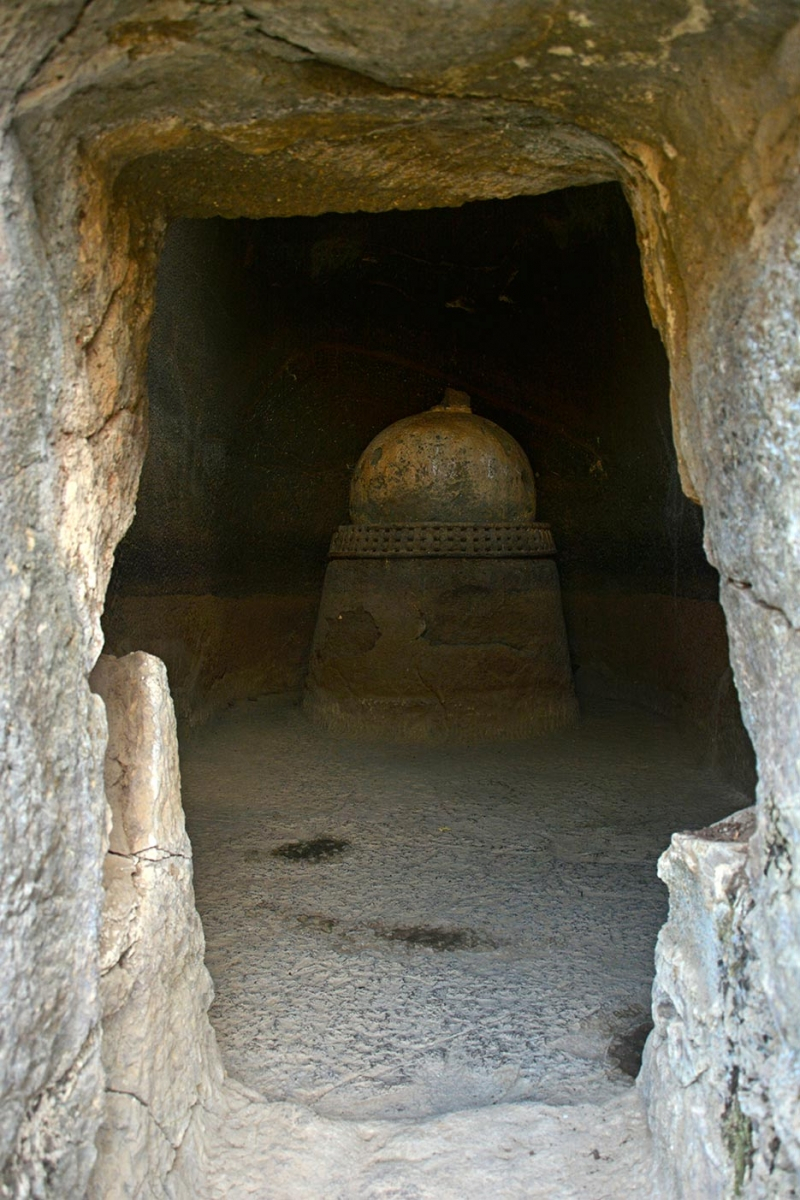 This is an unfinished apsidal chaityagriha devoid of aisles and pillars inside. The apsidal hall is 5.4 m deep, 2.5 m wide and 3.8 m high. The side walls of the hall rake inwards slightly and the roof is barrel shaped. A stupa is placed at the apsidal end. Its harmika is broken. The drum’s diameter measures1.7 m at the base and is 2.3 m high. The sides of the drum taper upwards prominently, and at the brim all round is a band of vedika pattern. In front of the hall is a screen wall about 1.2 m thick, which features a roughly hewn rectangular doorway (1.7 m high and 80 cm wide) and a window which admit slight into the hall. This window is set below a large roughly hewn semicircular arch 2.7 m wide at the base, 2.1 m high and 80 cm deep. This cave dates back to the middle of the second century AD.