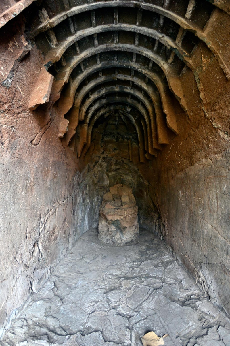 This is a chaitya hall situated a little away to the west from Cave 11 (Fig. 16, also see Fig. 13.2, left). This cave consists of an apsidal hall (6.6 m diameter, 2.3 m high, 4.6 m wide) but has no pillars. The roof is barrel vaulted and is decorated with ribs crossed by rafters, all cut in stone. At the back, the roof is fashioned as a quarter sphere with the curved ribs meeting at a point at the top. Just below this on the floor stood a stupa which is now dilapidated. On the head of the dome is an oblong mortise which was meant to receive the harmika.