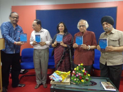 Launch of Brittle Ice, Mohan Gehani's bilingual collection of poems, at Sahitya Akademi, Mumbai: (From left) Krishna Kimbahune, Regional Secretary, Sahitya Akademi), Mohan Gehani, Menka Shivdasani, Vasdev Mohi and Dr. Prem Prakash Sindhi Advisory Board, Sahitya Akademi
