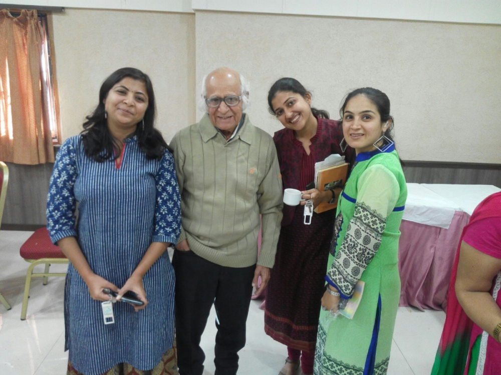 Vasdev Mohi with young Sindhi writers Bharati Sadarangani, Rekha Pohani and Mamta Parwani (Photo courtesy Vasdev Mohi)