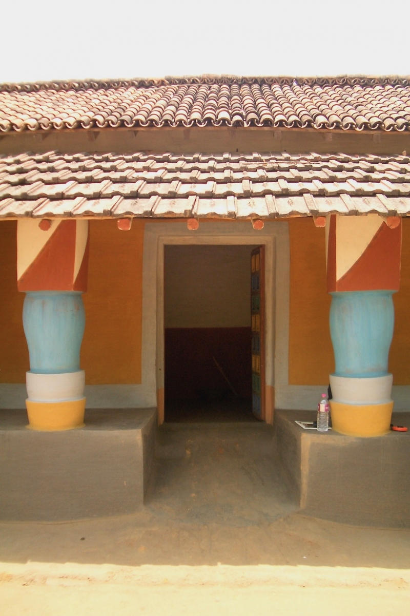One of the more unusual practices, found in very few villages in Singhbhum, involves the carving of mud columns and then painting them in bright colours. A complex technique, this involves the making of a column by stacking layers of mud, and then carving it into desired shapes after the mud has set. The column is then plastered following the regular process described earlier. While these are not strictly murals, the process is clearly part of the gamut of decorative practices for mud houses. It is also interesting to note that the carving of the mud walls is usually done by men, while the painting is done by women, making this practice an exception on account of the gendered roles involved in its making.