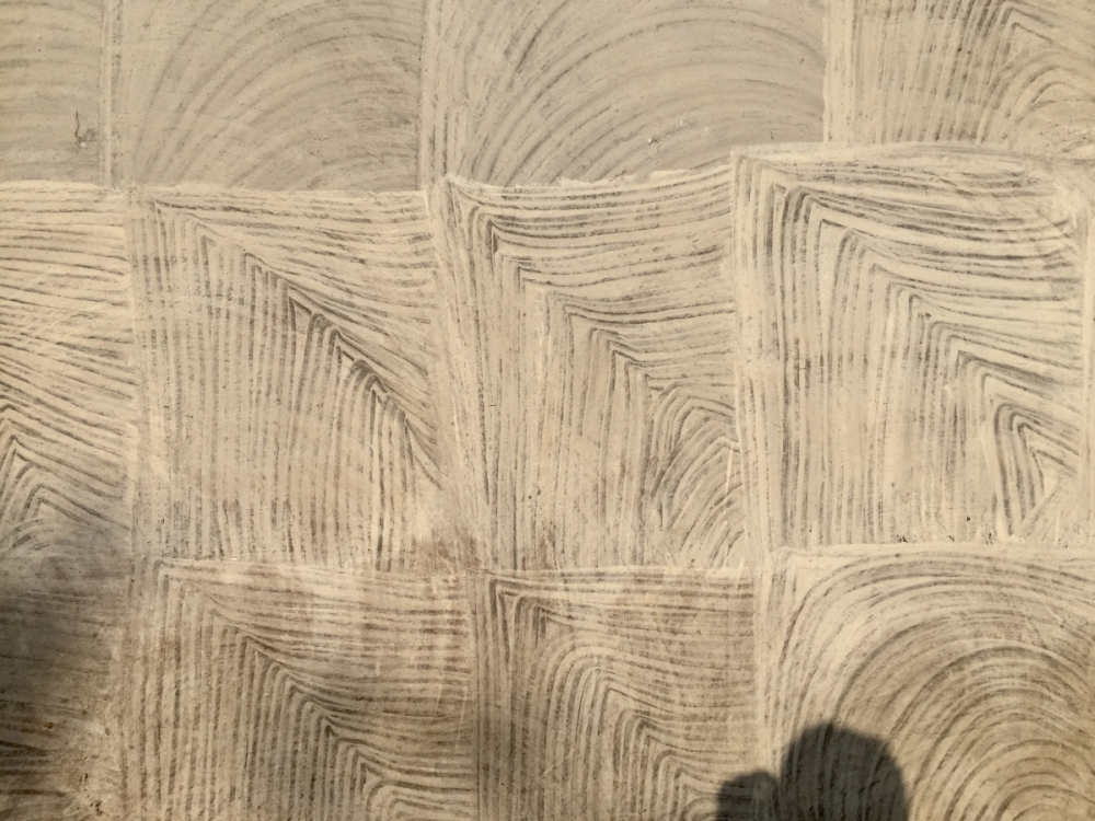 Comb-cutting of clay is an unusual practice carried out by Kurmi women in some villages around Hazaribagh. The women artists first apply a layer of black manganese clay to the wall, and then apply a second layer of whitish kaolin clay. When the second layer is just set (but not fully dry), women scrape out lines in the wall and create designs. Elephants, big cats, deer, peacock, and floral designs are common designs created in this manner. The final mural is a subtle work in the muted colours of the natural clays.