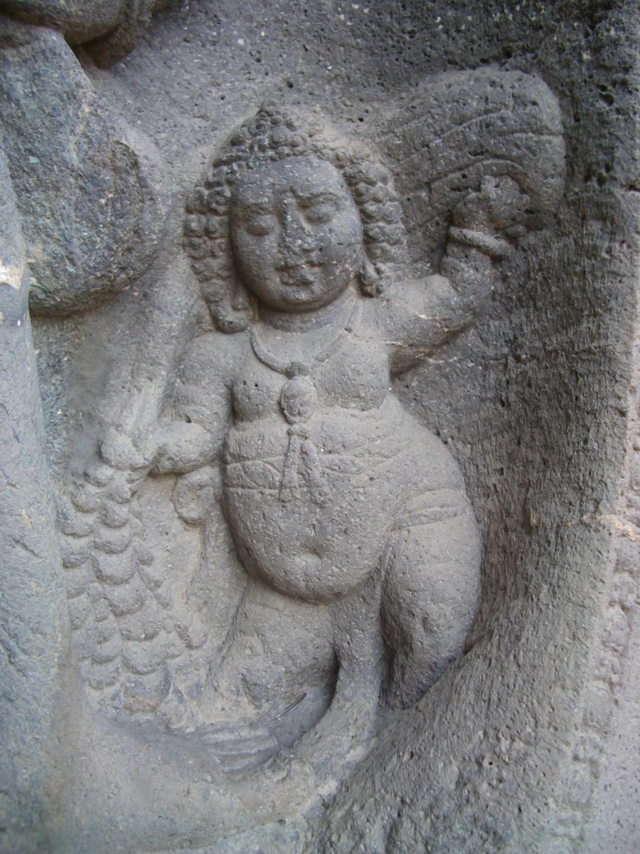 It is, of course, a doctrinal contradiction which characterizes both parts of the imagery; simply speaking, one who aims for nirvāṇa should not seek material wealth or bring children forth into the world. However, human nature wins over doctrine and does not care for religious justification. In the caves of the Buddha the yakṣas bestow rolling coins and frolicking children. This part of the caves’ decoration was certainly of no lesser importance then the visualisation of Buddhist dogma, and because of this should by no means achieve less attention. It is not easy to find a proper denotation for these two kinds of representations. It would be not proper to label all of the representations connected with material wealth as “profane” because the yakṣas and Kubera granting wealth are deities; that is, they are divine. They are, however, certainly less “divine” than representations of the Buddha and of all of the topics connected with his teaching.