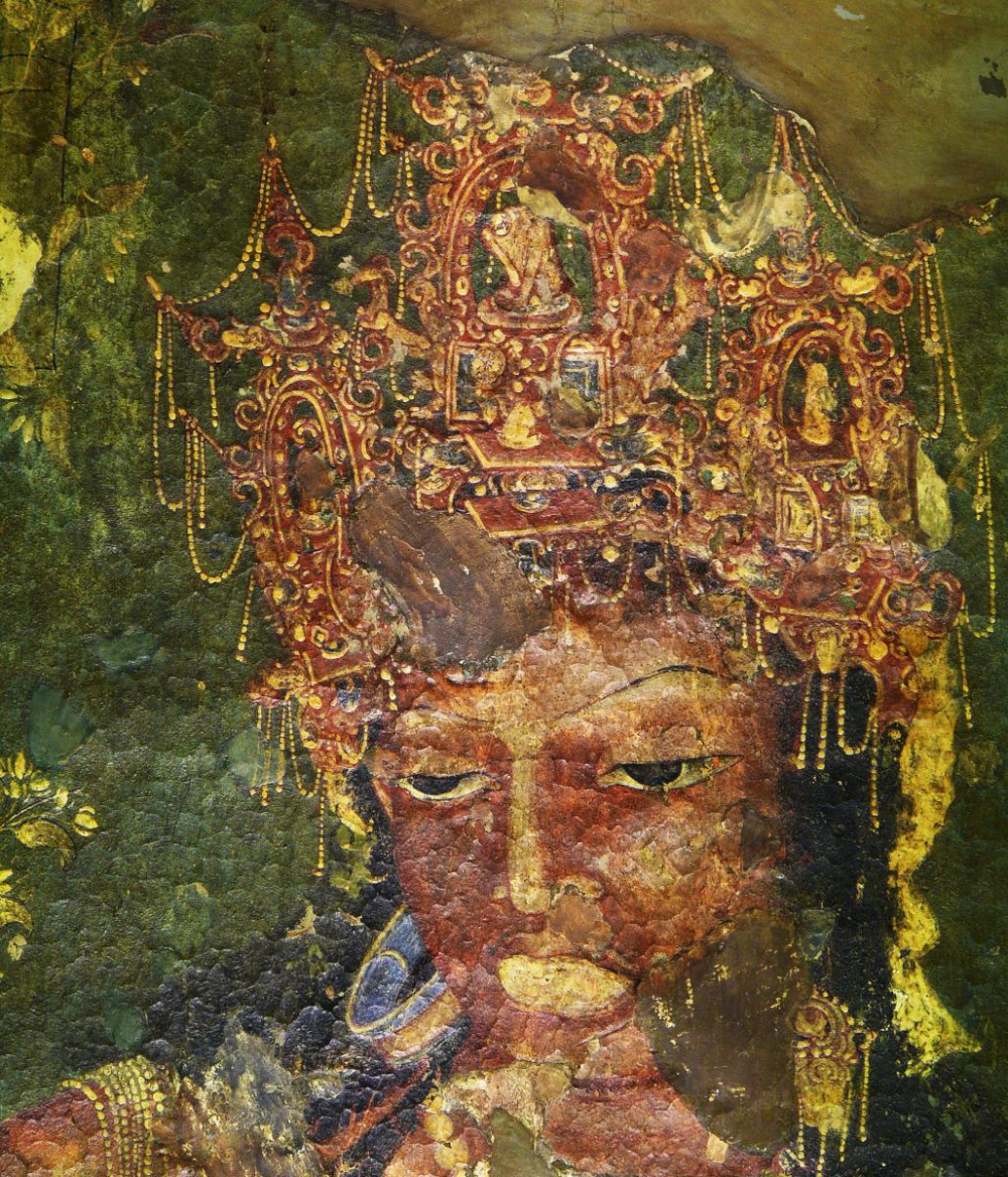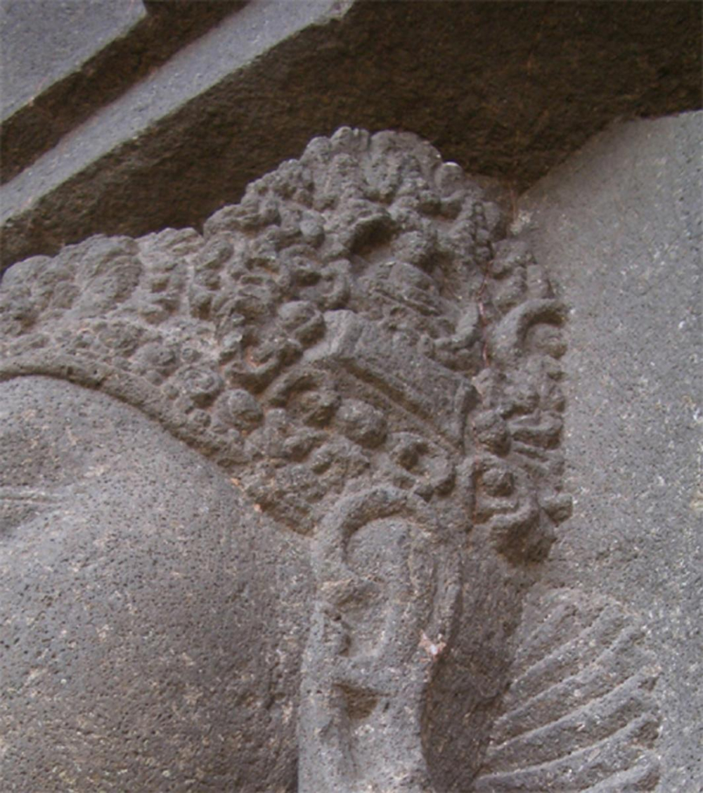 The oversized kings in the rocky landscapes in Ajanta (Fig. 9 a-b)[5] are usually explained as Bodhisatvas. This can not be denied even if they are, first and foremost, imbued with the earlier imagery of the leaders of the genii. It is worthwhile to stress that the kings dominating the landscapes do not exhibit the iconography of the Bodhisatvas, such as Avalokiteśvara, which was well known in the Ajanta caves, but instead demonstrate some features which are not to be met again: The most famous of the “Bodhisatva Kings”, located on the right side of the entrance to the antechamber in Cave I, bears a little figure without a head on the front of his crown (Fig. 10 a-b).