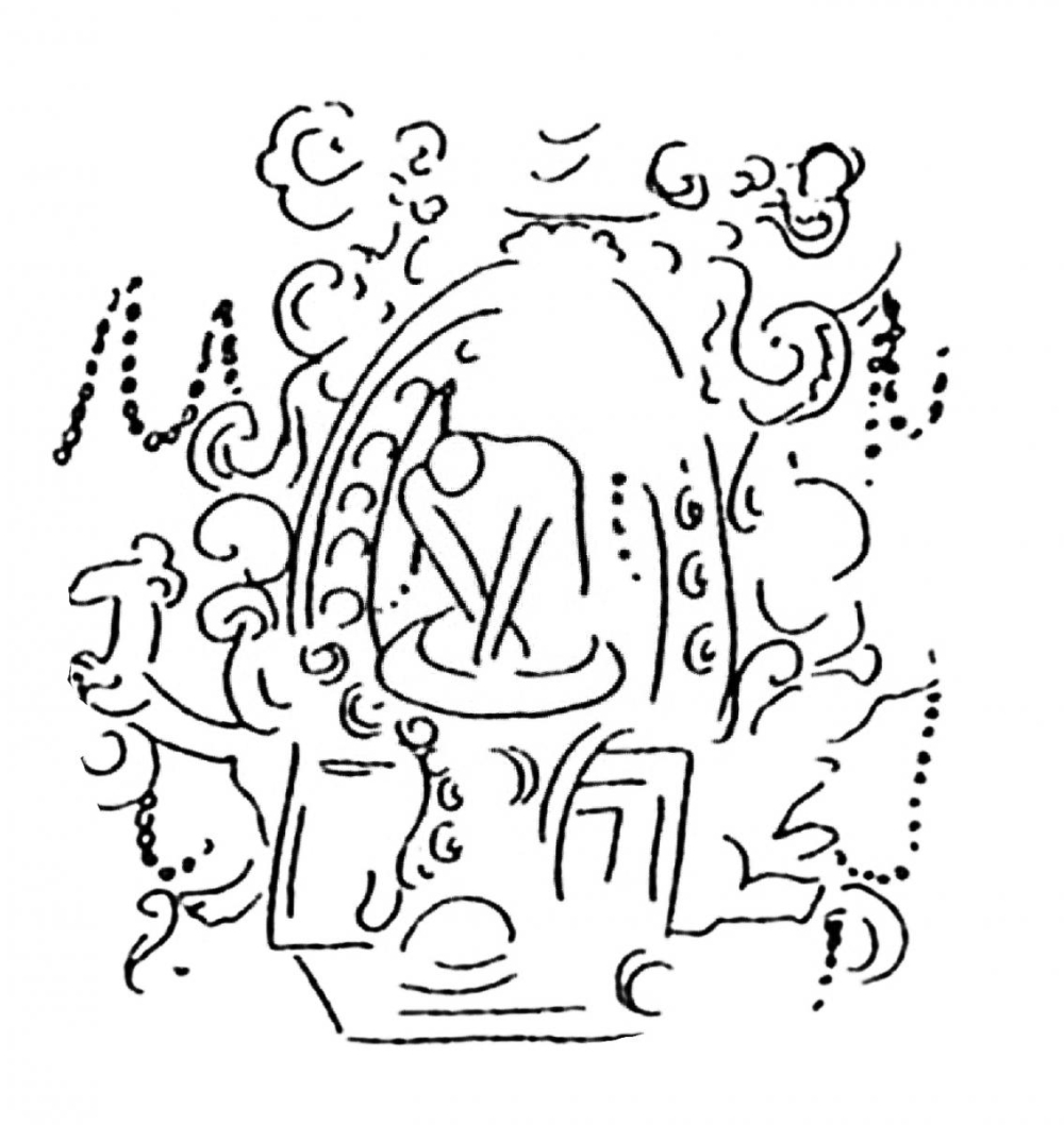 One could imagine a broken model which the painter might perhaps have carelessly copied; this is, however, not the case, as the crown of one Bodhisatva King in Cave II (who is, in fact, standing in the same position to the right of the entrance to the antechamber) likewise displays a strange, squatting person, apparently without a head (Fig. 11 a-b-c).