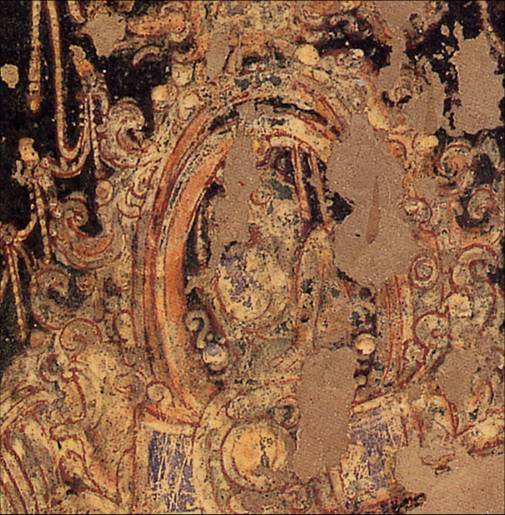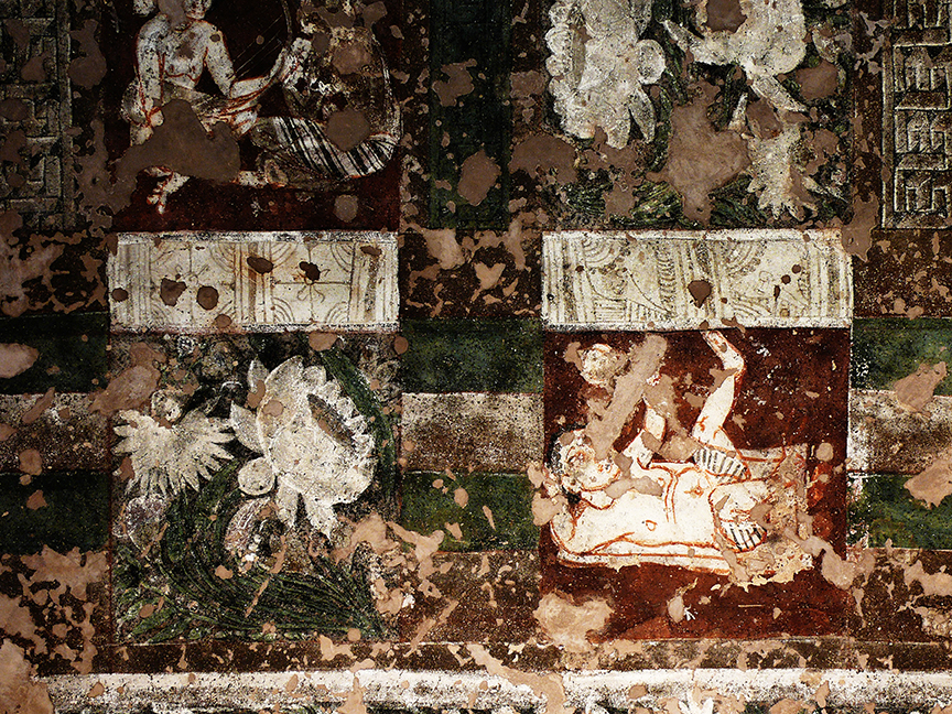 Generally, however, the representations of the world of the yakṣas and other genii are set apart from the other paintings because of the fact that they are represented in different places; as stated earlier, they can be found on the sides of the entrances, as well as on the ceilings, pilasters, and pillars.