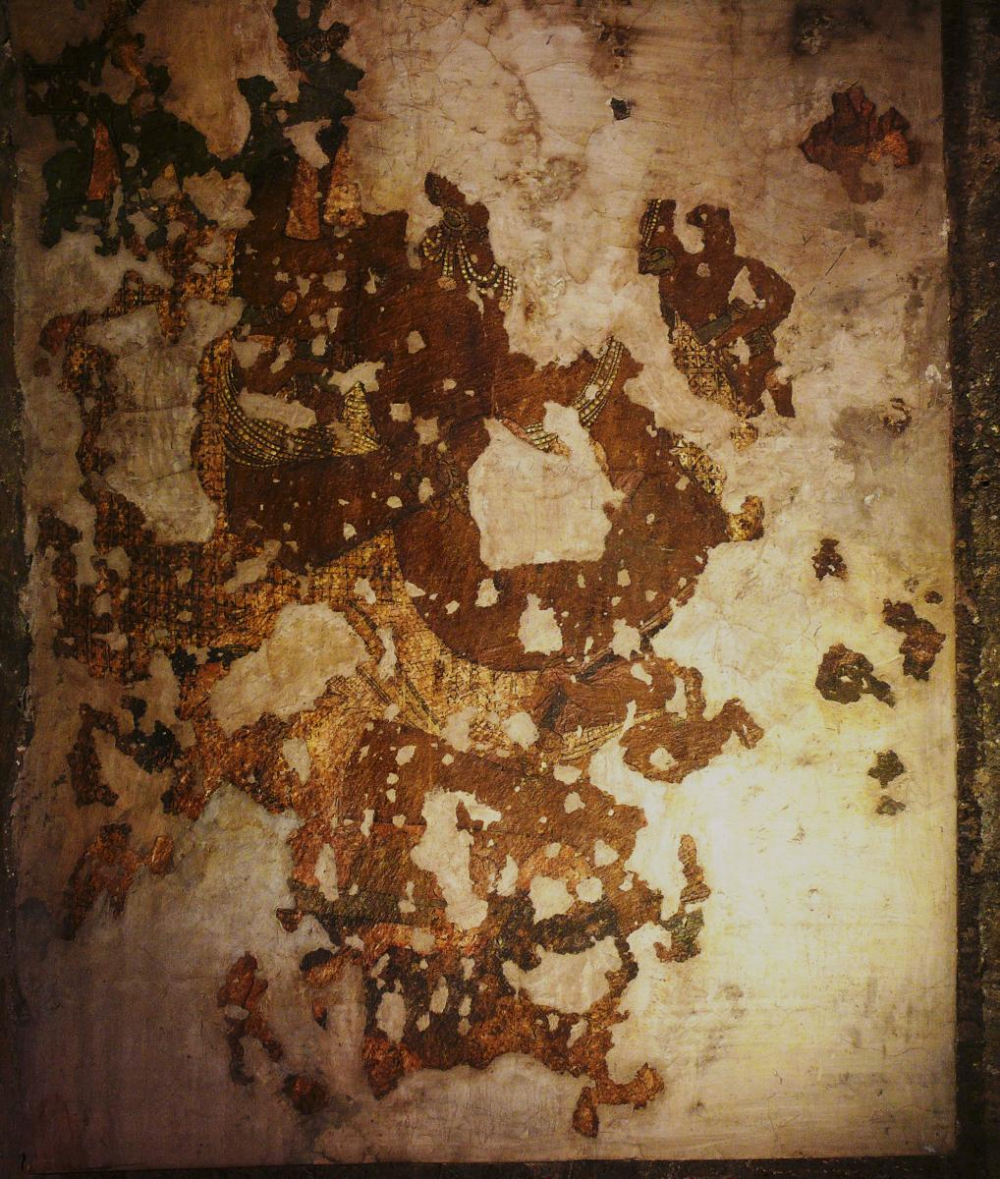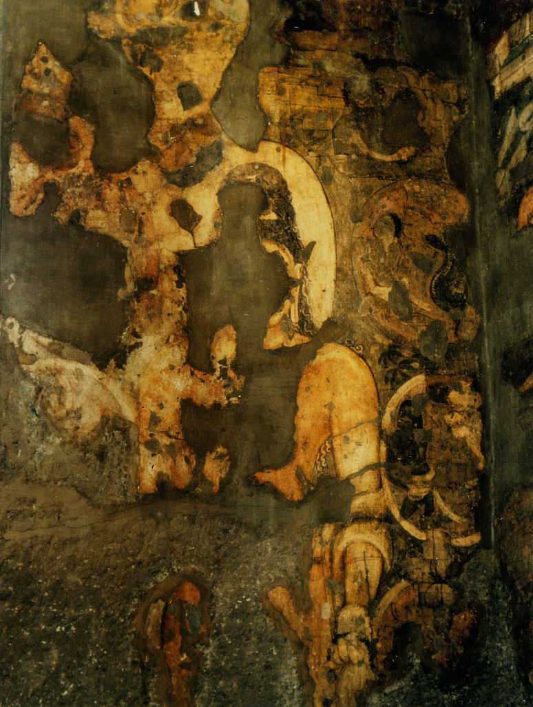The painting continues on the side wall (Fig. 21), stretching out towards the Wheel of Rebirths: The wandering merchants appear to be the same as those who escaped from death by giant snake, and Māṇibhadra to the right of Avalokiteśvara, who aids at times of peril, must be seen as the guardian of the wanderers – which, in fact, he truly is (references in Zin 2003a/(in preparation): No. 28): The yakṣa Māṇibhadra (Maṇibhadra or Māṇicara) was a powerful deity of Old India, and the inscriptions allow us to recognise him in several sculptures, as in the famous yakṣas from Parkham and from Pavaya. There are other inscriptions which refer to him as “caravan leader”, and still others providing information about donors who gave to Māṇibhadra; they belonged to the merchants’ guilds. Finally, there are different statements which can be found in literary sources, among others in the Mahābhārata (III.61.122-123), which allow us to recognize Māṇibhadra as the protector of the traders.