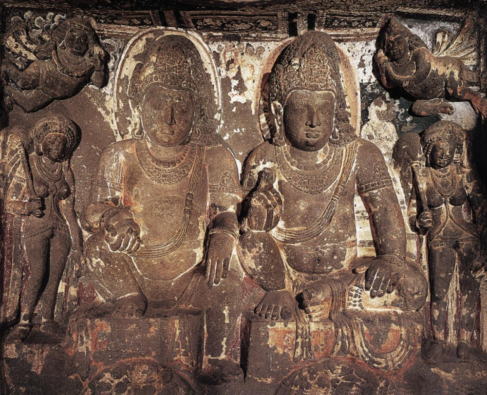 The decoration of the caves illustrates two different complexes of themes. One of these is clearly Buddhist and is oriented towards the perfection of moral qualities, future lives, nirvāṇa or the Buddhahood; the second shows the mostly pan-Indian world of the genii and is oriented towards material prosperity in this life.