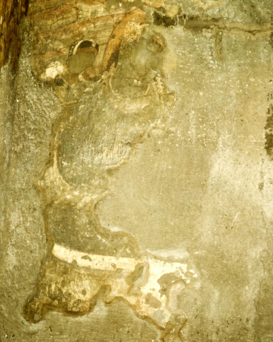 This little figure calls to mind pictures of the yakṣas from the same cave (Fig. 12).[6] At the present state of knowledge, an explanation for this peculiar representations cannot be given – this is no different from the elusive unambiguous explanation for the “Bodhisatva Kings”. It appears to the present author that research should lead in the direction of the yakṣas rather than the Bodhisatvas; after all, it must be always remembered that the vinaya of the Mūlasarvāstivādins which, as Schlingloff has shown, was the literary basis for a great part of the narrative paintings, speaks about painting a yakṣa image at the entrances to the monasteries and of a yakṣas holding a garland at the entrances to the gandhakuṭīs, i.e. Buddha’s cells.[7]
