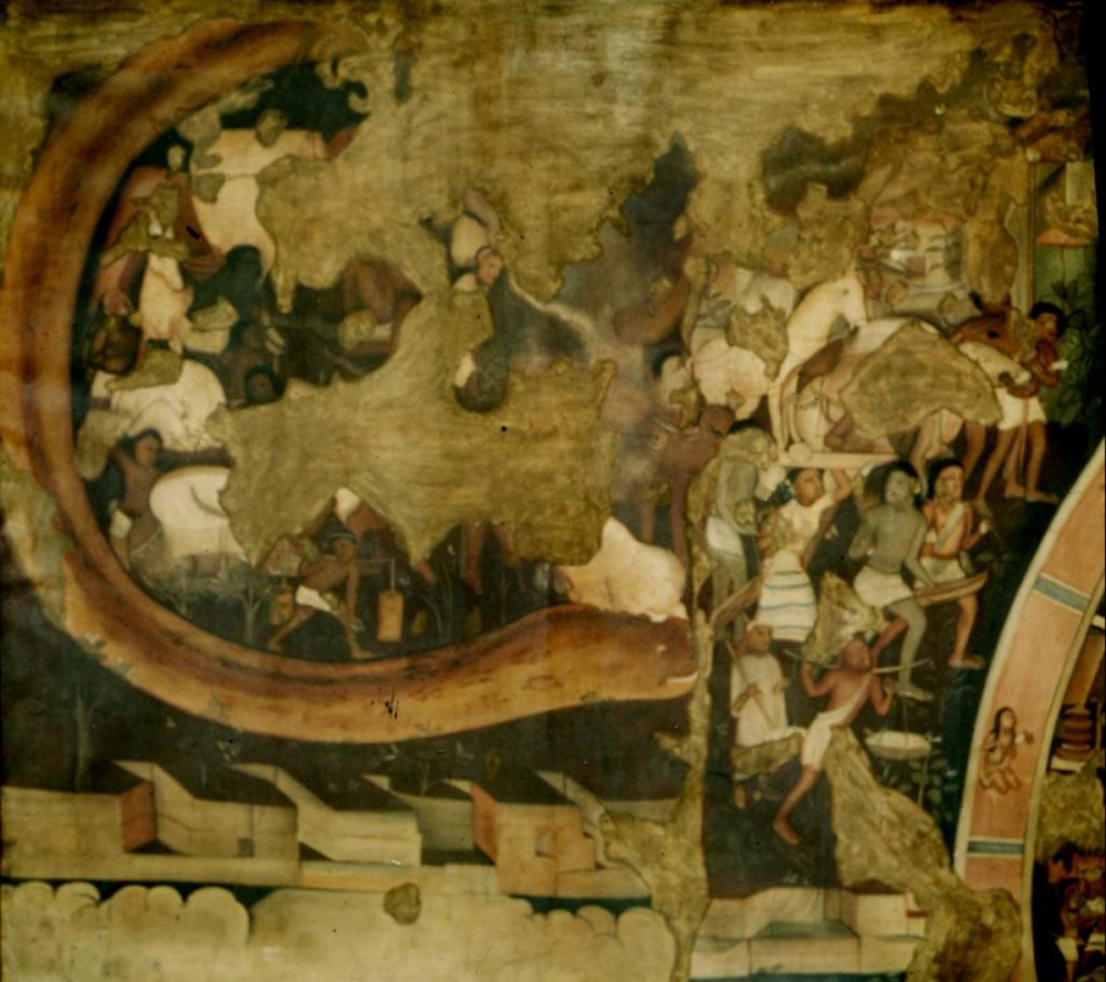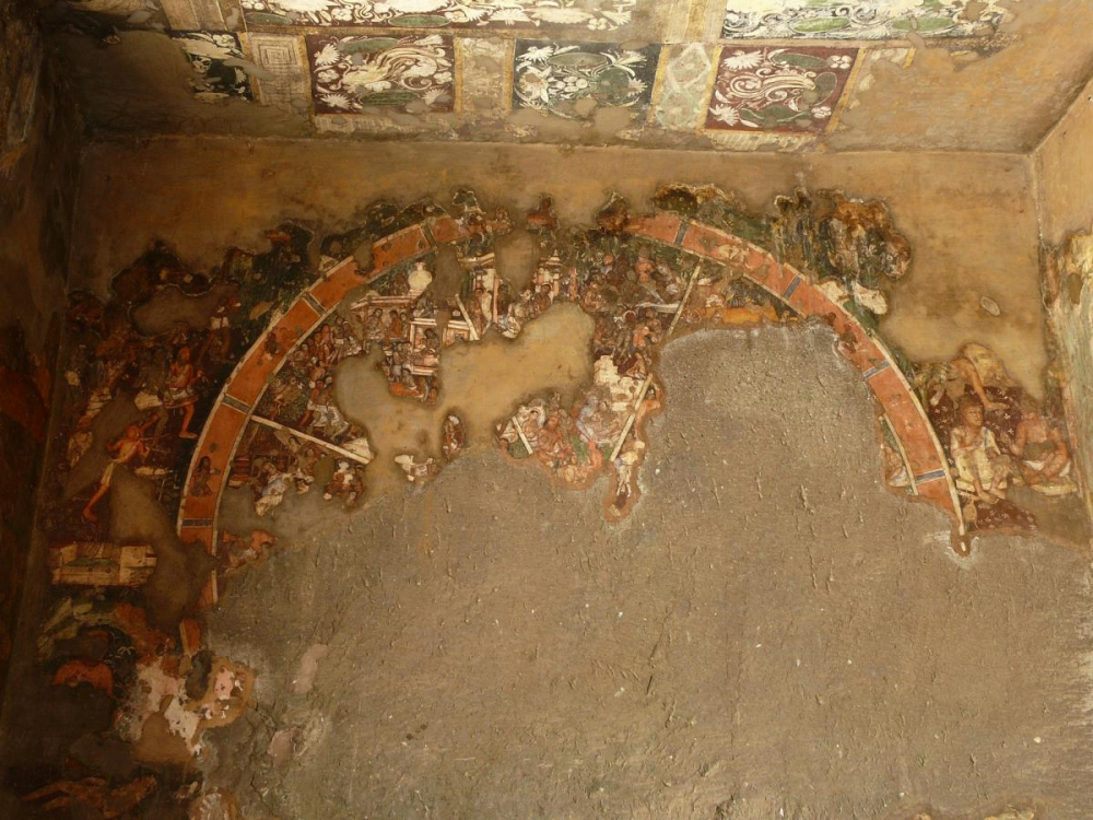 The arrangement of the paintings is, namely, meaningful: The upper part of the front wall shows a jātaka story (Fig. 19).[11] It is the Siṃhāvadāna (Schlingloff 2000/2013: No. 24), the narrative about a lion who helped a group of merchants to escape from being killed by a giant snake.