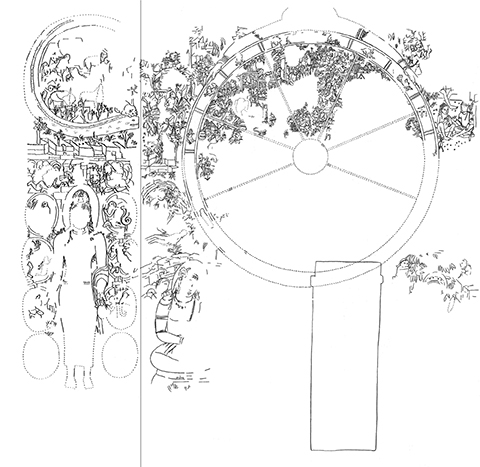 The left side of the Wheel, together with the painting on the veranda’s front wall which continues into the Wheel, directly connecting with it on the left, works more by means of an associative visual language as an illustration of the text (even though one of the physicians mentioned in the text appears here, depicted seated over the corpse of a person he could not cure) and represents different aspects of the human wandering – which should certainly underline the essential wandering through different rebirths inside of the Wheel. It is interesting to focus on the elements of the depiction in order to understand of the role of the yakṣa Māṇibhadra in this context.