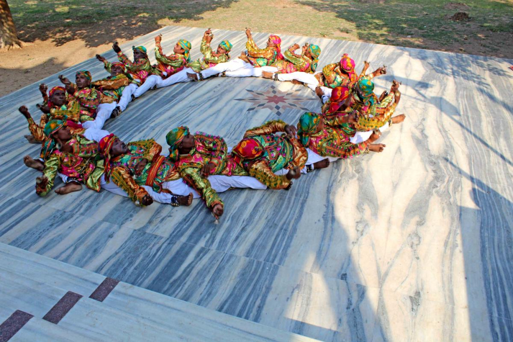 - Dancers lie down on the floor in a circle and playing manjira swiftly move their hands in unison from one side to the other. They sit and sway their bodies from left to right, bend torso from waist, touch knees with head and once again return to the original sitting position. Gradually rising, they run in a circle like the rushing ebb.