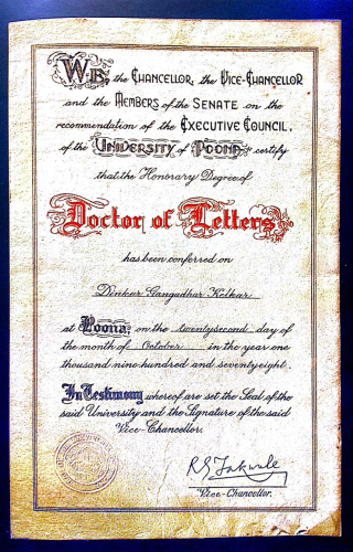 Dinkar Kelkar’s efforts to single-handedly establish a museum and to make it a centre of educational activities are exemplary. For this, he was felicitated by the Indian Centre for Encouraging Excellence. Later in 1976, FIE foundation of Ichalkaranji, Maharashtra, honoured Kaka with its prestigious award. In 1978, the Pune University conferred on him a DLitt degree for his achievements, following which Dr Mulk Raj Anand, the famous novelist and art historian, organised a ‘Dinkar Kelkar Festival’ in Pune from November 2 to November 9, 1978. The Max Mueller Bhavan in Pune also felicitated Kaka, as he was fondly called, by arranging a lecture series by the archaeologist Prof. Herbert Hertel in his honour. Further, Kaka was made an Honorary Fellow of the Museum Association of India and was also given the membership of the Archives and Archaeological Council of Maharashtra.