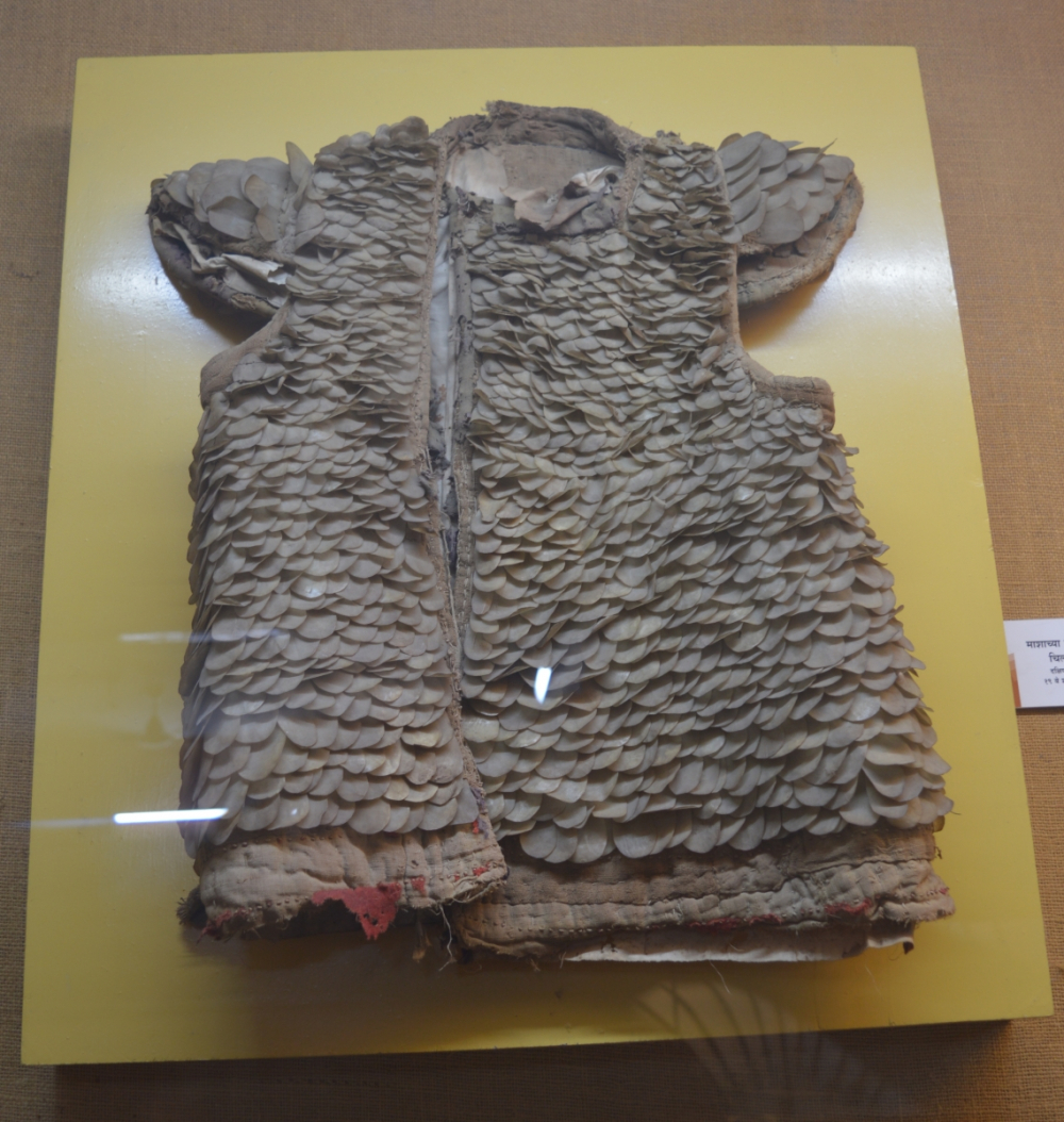 The collection of arms cannot be completed without fire-arms. Cannons, flint-lock and match-lock guns, Percussion cap, long barrel Muskets, Blunder-burst along with revolvers are unique in style. The gun-men used to carry the gun powder to blow these guns in flasks. Kelkar Museum has a remarkable collection of such flasks. Made of different materials like wood, metal, shell these gunpowder flasks are from seventeenth century onwards; and mainly of Rajasthani style. The wooden flasks are tiger-faced while one in the shape of coiled snail has makara-mukh. Among armours, the intertwined chains were famous in medieval period. Fish-scaled, crocodile hide armours and leather jackets are noteworthy. (Fig. 3)