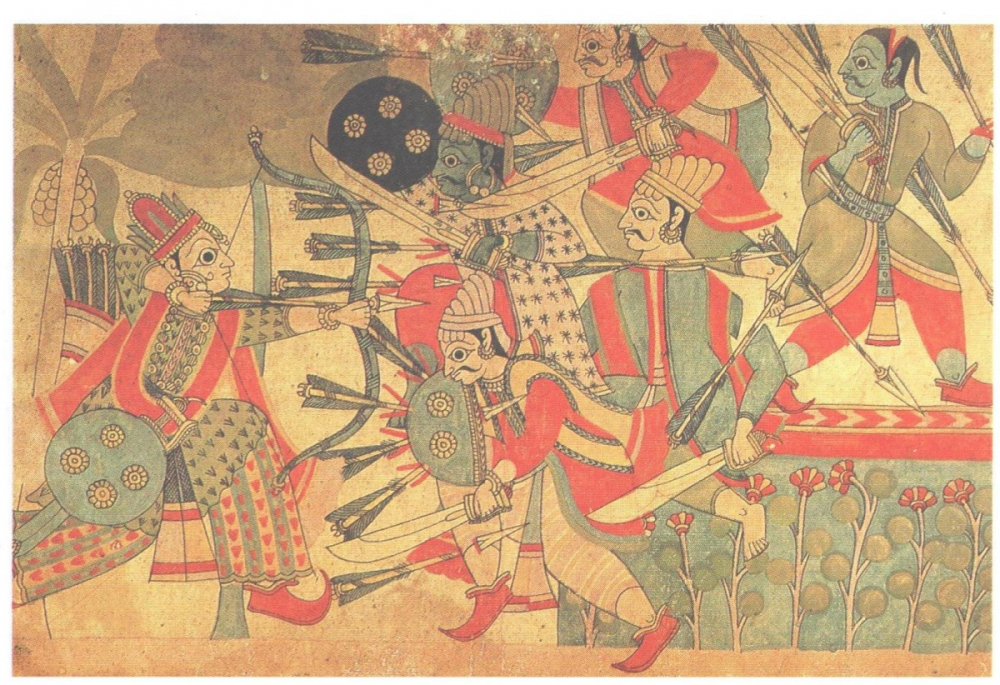 Another pride variation of this type is 17th and 18th century Paithan ‘Chitrakathi’ paintings. Originally from Paithan near Aurangabad (Maharashtra), they strikingly resemble the leather puppets in themes and style. Along with Ramayan and Mahabharat, they mainly deal with the Hari Vijaya (story of Harischandra), Vetal-Panchavisi (related to magic), Chhalachhandu Akhyana (folklore) etc. The paintings are done on hand-made paper and two paintings are stuck back-to-back. Numbering more than 5000, they demonstrate a rich tradition of this dying folk art and help in understanding the contemporary society, dressing, jewellery, weapons, and village life. (Fig. 6)