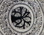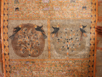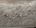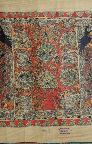 The evolution of Mithila painting is associated with three communities in the Madhubani district of Bihar. These communities are Brahmins, Kayastha and the third one is Dalit or Paswans. Women of Dusadh caste (mostly in Jitwarpur village) and some other Dalit castes like Chamar are doing all forms of traditional paintings in Godna style. The chief deity of the Dusadh’s is Raja Sailesh or Salhesh and he is the key character of Godna painting or Salhesh painting. They used to paint family members of Salhesh, his consorts Dauna and Malin, tigers, guards and some imaginary characters like Hurar, decorated with trees, animals and minerals in sequences. They also make Salhesh sculptures and clay reliefs of animals and birds. These art forms are for ritual purposes and also for decoration.