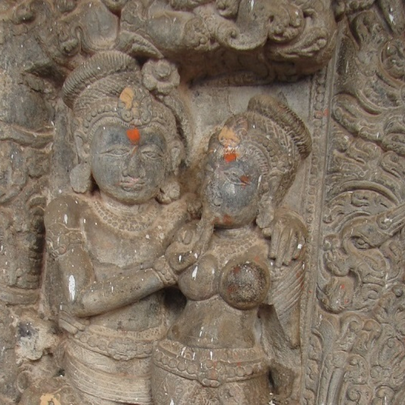 The iconographic programme of the temple is predominantly Vaiṣṇava. Various forms of Viṣṇu are executed on the temple- Trivikrama, Vāmana, Narasiṁha, Varāha, a fierce four-armed Viṣṇu, a benign four-armed Viṣṇu and Śeṣaṣayi Viṣṇu among others. The carving of Śeṣaṣayi Viṣṇu on one of the maṇḍapa doorway is exquisite. Between the mithuna and the Nāga band Viṣṇu is rendered reclining in peace on his serpent coil. The depiction of Viṣṇu on the lintel as well as Garuḍa holding nāga tails further attests the religious affiliation of this temple to Viṣṇu.
