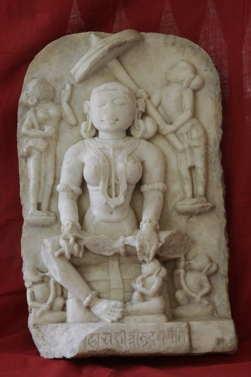 This marble slab (Fig. 5), about half a metre in height, is an idealized portrait in which Udayamati is seated on a cushion. She bears a lotus flower in her right hand; the left hand rests in the lap, and holds an indistinct curved object, such as a book, or a slab for sandalwood paste. In the scene, as many as five people attend to her, testifying to her exalted status: two female figures flank her at the level of her shoulders, one with her arm in the attitude of adoration (patākāhasta), and the other bearing a parasol. Three smaller male figures, either with garlands in hands, or joining their hands in worship, are at the level of the seat. A short inscription on the face of the seat reads ‘Mahārājñī Śrī Udayamati’. The sculpture and the writing date to the 13th century.