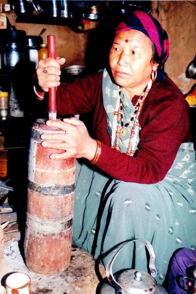 Jadu is like porridge. Prepared with Palti (buckwheat) flour, the batter is cooked in a pot. While on the fire it has to be constantly stirred. Jadu is a staple food of the Bhotia community.