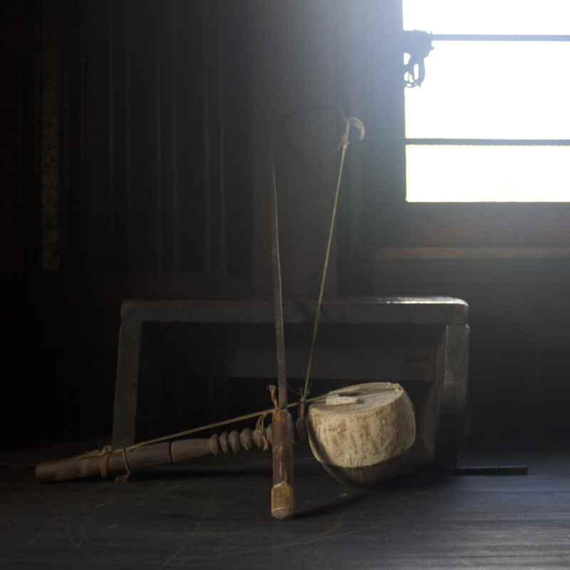 Nrah is a stringed instrument, a chordophone, used by the Ruangmei people, akin to a violin.[1] It has a hollow body made out of a coconut shell that has been cleaned and cut in half and covered with animal skin, preferably that of a buffalo. The strings for the main body and the iron bow are made from horse’s tail. The main body and its horsehair string are bowed and not plucked to generate sounds. The nrah has a separate removable component, a bridge made of wood to raise and support the strings to generate music. (Figs 1 and 2)