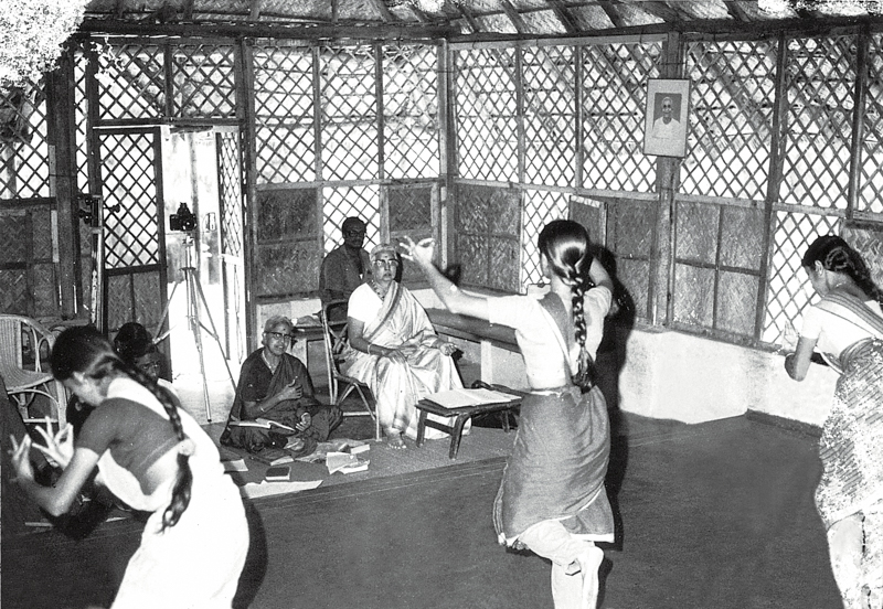 After the Sastry family moved to Madras, due to their proximity to many foreigners at the Theosophical Society, Rukmini got attached to a young English lady named Eleanor Elder, who had studied dancing with Margaret Morris in London and was now directing her attention to reviving the ancient Greek dance following the precedent of the redoubtable Isadora Duncan and her brother Raymond. To conduct her experiment and enquiry, Elder roped in some of the European and American residents at the Theosophical Society. Elder put up shows from time to time. In one of these shows, a Tamil version of Tagore’s Malini was performed, Rukmini appeared briefly and sang a song. This was 1918. The December 1935 performance proved to be a turning point in many ways—for Rukmini herself, of course, but also for the development of Bharatanatyam. The grand success of the performance led to the creation of a unique dance community in 1936 called the Kalakshetra. It had been conceived as an integrated community—a family. The residential cottage, the classrooms, the rehearsal hall, mess and administrative block were all cheek by jowl and there was energy in the air. There was Western discipline certainly, but old timers recall how after classes they could freely assemble and make small talk and bond as a family.