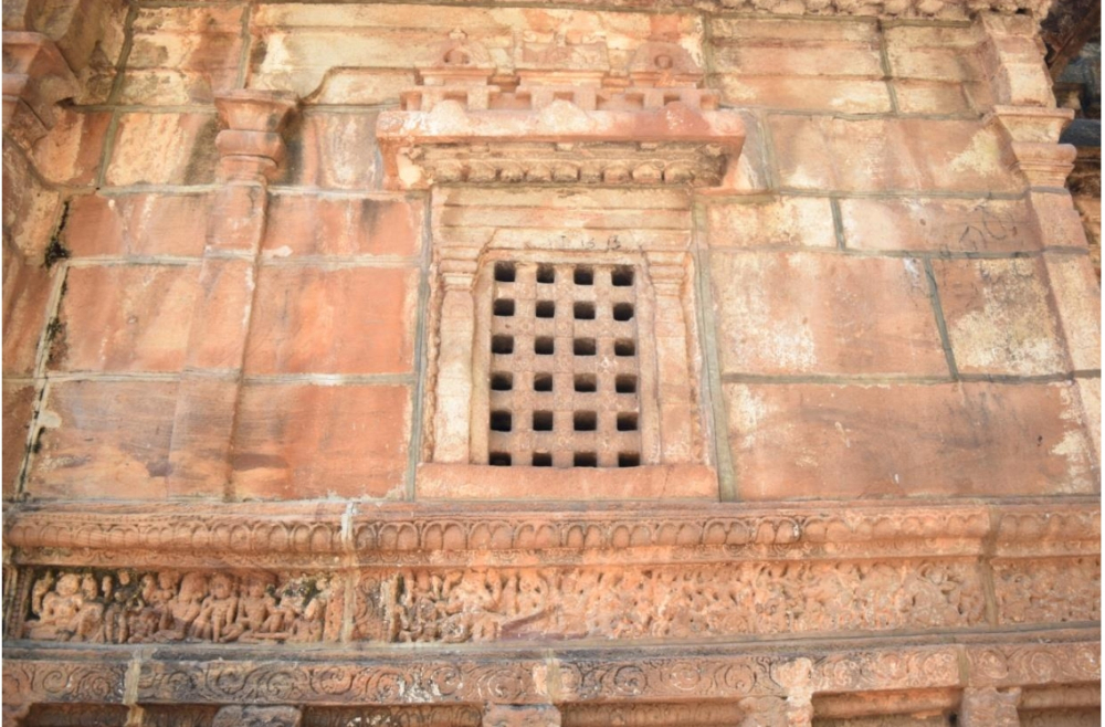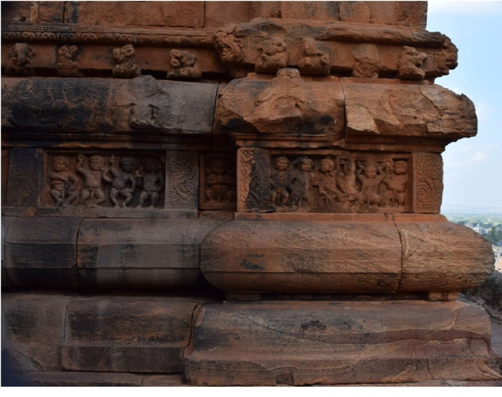 These structural temples retain a number of features from their excavated counterparts. The gaṇa friezes executed on the base mouldings of Caves I, II, and III are continued on the Upper, Lower, and Mālegitti Śivālayas (Figure 4). Indeed, the layout of these temples is no different from the rock-cut caves, the verandas have simply been replaced by mukhacatuṣkīs. There is, however, definitely a departure from the cave architecture in terms of the development of the superstructure over the vimāna (temple), path for circumambulation (sāndhāra prasāda), the execution of latticed windows (jāla-vātāyana), the chief iconography of the temple unfolding on the bhadra (central) niches of the temples, the beginning of narrative panels, and use of miniature shrines to embellish the exterior walls of the temples. This is not to say that the Bādāmi caves and the Bādāmi temples represent linearity in terms of their construction.