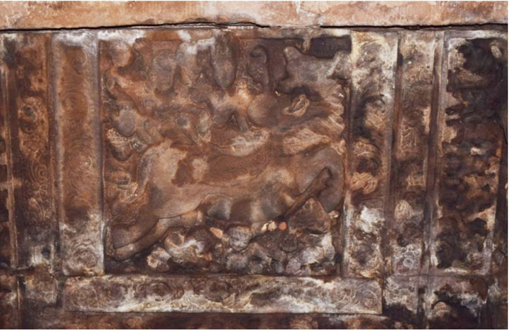 The chief ornamentation scheme of the Lāḍ Khān͂ temple consists of its sculptures portrayed on the central niches of its gṛhapiṇḍī. The north wall is executed with a sculpture of Ardhanārīśvara, the west wall with Sūrya, and the east wall with Viṣṇu. Other carvings include a depiction of Garuḍa holding nāga-tails on the lintel of the main maṇḍapa, and Varāha, śaṅkha (conch), cakra (wheel), darpaṇa (mirror), catra (umbrella) and cāmara (fly-whisk) in the mukhamaṇḍapa. The carvings in the mukhamaṇḍapa suggest the royalty of the temple. The centre of the main maṇḍapa is occupied by a huge Nandi. The religious dedication and time period of this temple are deeply contested.[x] However, on stylistic grounds it is dated to the end of 7th century CE (Meister and Dhaky 1986:44‒45).