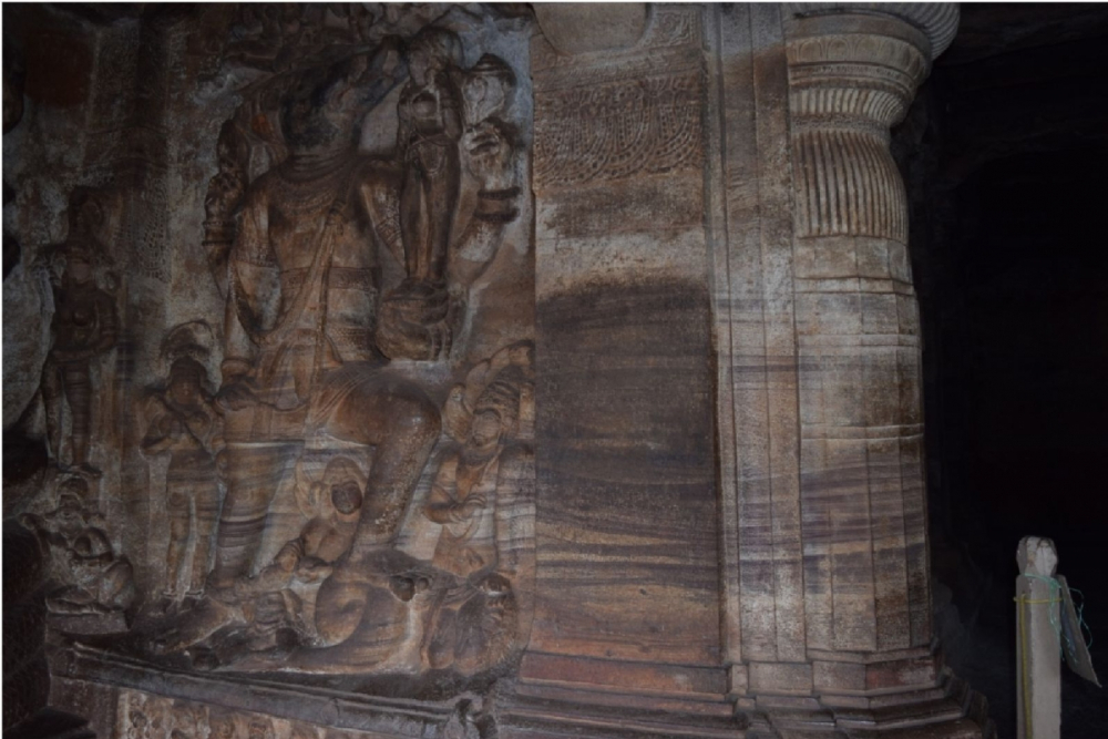 The chief iconography of Cave I includes an eighteen-armed Naṭaraja in a projecting cell to the right end of the facade. Śiva here is accompanied by Nandi (his vāhana or vehicle), Gaṇeśa, and a drummer. The left end of the facade represents a dvārapāla (door-guardian). Above this panel lies a small sculpture of Umā-Maheśa seated on Nandi. The veranda houses the sculpture of Harihara accompanied by consorts and Ardhanārīśvara to the right. Further inside, the main maṇḍapa contains an image of Durgā Mahīśāsuramardinī with Mahīśa in animal form. She is flanked by Gaṇeśa on the right and Kārtikēya on the left. Other meagre carvings include figures of Gajalakṣmī, seated Śiva and Pārvatī, Śeṣaśāyi Viṣṇu, Narasiṁha Viṣṇu, Gaṇeśa, and two devotees worshipping Śivaliṅga, depicted on corbel faces. The garbhagṛha enshrines the Śivaliṅga. This Śaiva shrine is dated to the 6th century CE.