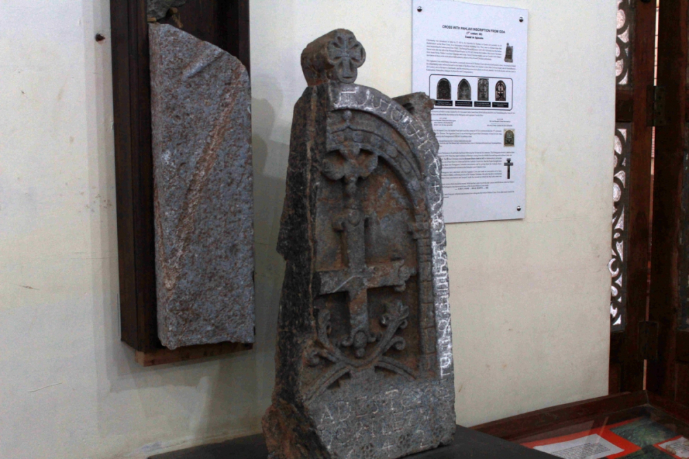 This granite cross is very similar to the Mount Cross—a rounded upper border with raised edges and Pahlavi inscriptions, and some Portuguese inscriptions at the base. A niche is carved into it, and on either side of the cross are two pillars, and a rounded arch above. The cross has arms of equal length with three budded ends, three steps at the base, and a dove on the top. The floral design is well-defined with prominent upward- and downward-directed portions, and there is a rounded arch just above the steps. This cross is now kept in the Pilar Museum in Goa.