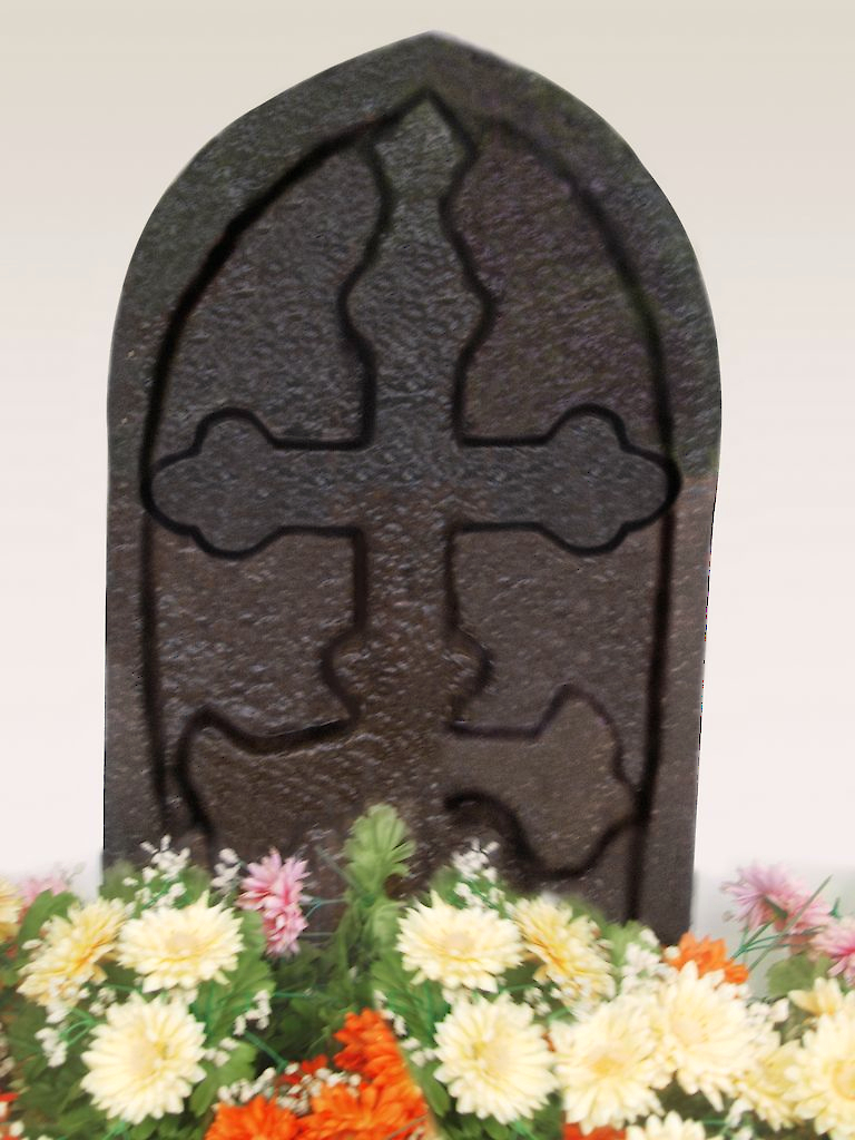 This cross is smaller and has a pointed border, in contrast to the rounded upper border of the Mount Cross. The pillars and arch are not seen. The Pahlavi inscription extends over the edge of the slab and outside of the border. The petals at the base of the cross are different from those on the Mount Cross. They are directed downward with only a small bud reaching upward on either end. The arms of the cross are almost equal in length, and the ends have three buds with an additional bud at the end. The dove on the top is smaller, and indistinct—it may be interpreted as either a dove or a flame. This cross is considered the older of the two, as its design is simpler and more primitive.