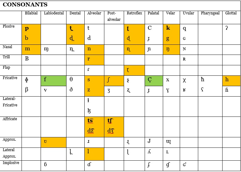The cells highlighted in yellow represent the ‘phonemes’ of Sarazi and the cells highlighted in green represent ‘allophone'. Phonemes are distinct sounds perceived in a language and allophones are various sounds which are perceived as variants of a single phoneme.