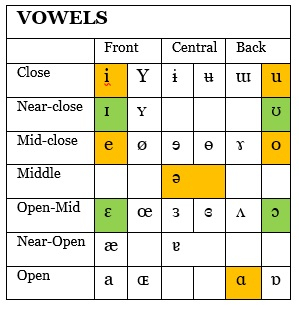 The International Phonetic Alphabet is to speech phonetics what a periodic table is to chemistry. The IPA tables below represent all the possible consonant and vowel sounds in human language. Consonants are classified based on manner and place of production of a sound and vowels are classified based on height of the mouth-opening, position of tongue in the mouth and lip-shape. One can refer to many interactive IPA charts available on the internet to make sense of the sounds.