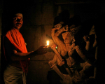 Durga is one of the most popular representations of the mother goddess in India, a concept which predates institutionalised religion and has parallels across the world. She is worshipped in Tantrism and Shaktism where the feminine energy and fertility associated with the mother goddess are venerated. In her warrior form slaying the demon Mahishasura, Durga is worshipped as Mahishasurmardini, and her victory symbolizes the triumph of good over the forces of evil within a human being. This event is celebrated anually during the 10 days of Durga Puja in the eastern regions of India. In western and northern India, the mother goddess is worshipped as Amba or Ambika. Ambika, or Kusmandini, is also an important yakshi in Jainism.