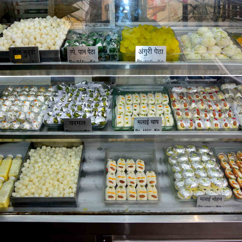 Sweet shops in both vegetarian and non-vegetarian neighbourhoods are divided into two sections—one section is entirely devoted to the traditional sweet stalls on the side. Every morning all the local mithai (sweets) shops serve aloo-chhola (potato and chickpeas) sabzi, puri and halwa. In the afternoons, they make fresh jalebi, imarti (dessert made from Bengal gram-based fried rings, filled with sugar syrup), samosas, pakoras and other snacks and sell those till evening all around Shahjahanabad. Different varieties are added according to different seasons—gajar/lauki (carrot/gourd) halwa during winters, and andarse ki goli (sweet balls sprinkled with sesame seeds), /suvaal (fried sweet) during monsoons. Habshi halwa made from burnt milk (black in color, thus named after the black people or ‘Habshis’ as they were referred to locally) is also quite popular during the cold months.