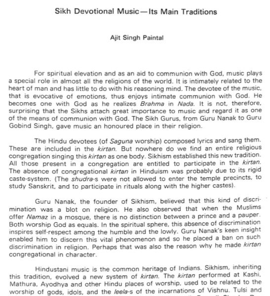 The article is a study about the muscial traditions of the Sikh devotional music. The article explores the importance of kirtan in Sikhism and other ragas composed to form a part of this genre.