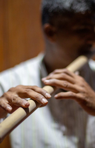Satish’s family has lived in Valagalli for generations, growing areca nut, paddy, and pepper. After finishing his ITI (Industrial Training Institute) training in Honnavar, Satish pursued a 2-year diploma in mechanical engineering from Hubli. While at Hubli, he shared a room with his classmate Viraj, who happened to be a flautist—this was his first exposure to the bamboo flute.