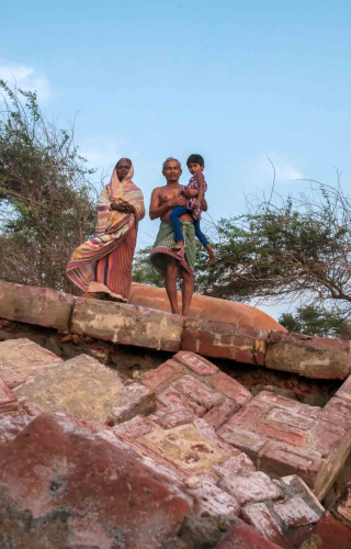 ‘We used to live by the river. We used to farm our land nearby. The river took everything away. Then we started living at the head of 12 Sowal. After Cyclone Aila (2009), increased riverbank erosion ate up our house. Displaced since then, we came here 7–8 years ago. Until last year, our new house used to get flooded too. Water entered even through the windows. This year we could stop the flooding by increasing the height of the hut. Where shall we go? We need a place to live peacefully with our children,” said Sheikh Sadek, Sheikh Naju, Asma Bibi and others of Baliara village on Mousuni Island.