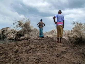 The Sunderbans delta is formed by the River Ganga entering the Bay of Bengal. In this last phase of its journey, the river deposits huge amount of silt on river beds. Long-term silt accumulation has been raising the water level gradually. At present, villages are just about 1.5 to 3 meters above the average sea level. During the full moon or the new moon, when tides can reach five to six meters high, many villages get flooded, and sometimes entire villages have collapsed and sunk without trace. Crude mud embankments form the only protection from the high water level. Though concrete embankments were constructed at some places after Cyclone Aila, they are in very poor condition or still incomplete. The danger of being submerged by rising water levels is all too real for people living here.