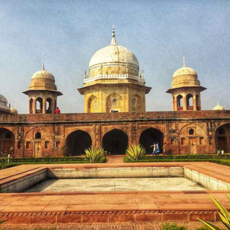 The quadrangular complex,within a fortified enclosure, has 12 chhatris (cupolas) and pavilions around it. Elevated on the ancient mound, the tall gateway opens onto a 174 sq ft marble-paved courtyard with a shallow tank surrounded by the garden. The galleries around the garden are believed to have functioned as a madrasa, believed to have received patronage from Dara Shikoh.