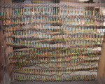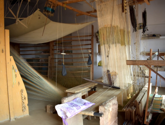 Velvet handloom weaving is a tedious task which requires great patience and precision. The Ansari family at Cholapur, Benaras are the only weavers in India who weave velvet fabrics on a handloom. The technique employed is quite complicated and yields merely an inch of the fabric per day, depending on the complexity of the design. The images show the elaborate set-up of the loom and the kinds of fabric that are woven.