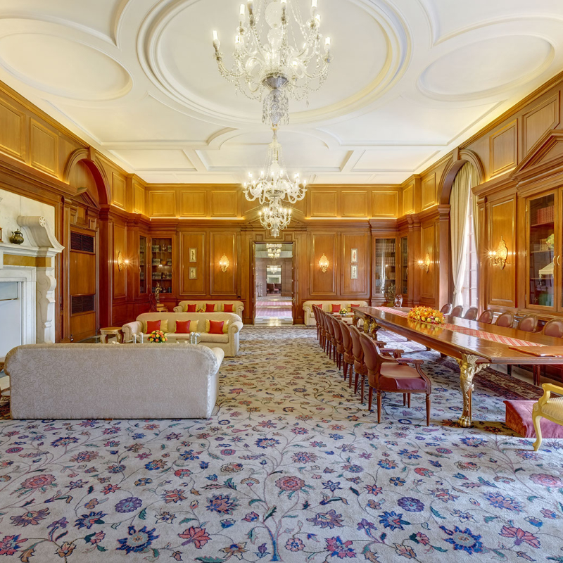 The carpets follow a definite design, and similarities in motifs and patterns are evident from room to room. The pattern of diagonal rows of repeat flowers, apparent in Kashmir shawls, is evident in several carpets such as those in North and South Drawing Rooms, the Dwarka Suite and the officers mess of the President’s Bodyguard. By using floral motifs instead of geometrical ones, he wished to evoke the feeling that one was walking amidst a flowering garden. Carpets are shaped for specific spaces within the house. For instance one of them is referred to as ‘Bottle Carpet’, alluding to its shape. In other places the space and size of the carpet are delineated by the pattern in the flooring—generally a thin border of grey Kota or yellow Jaisalmer stone set in the white marble.